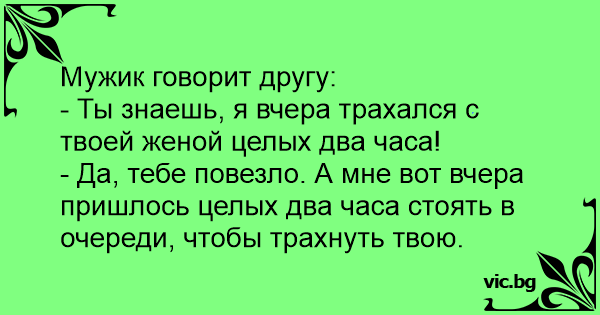 - Да, тебе повезло. А мне вот вчера пришлось целых два часа стоять в очереди, чтобы трахнуть твою.