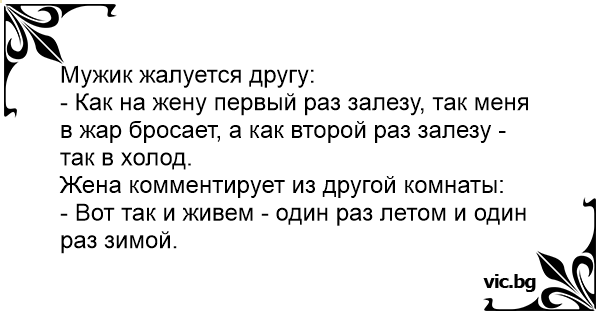 - Как на жену первый раз залезу, так меня в жар бросает, а как второй раз залезу - так в холод.
