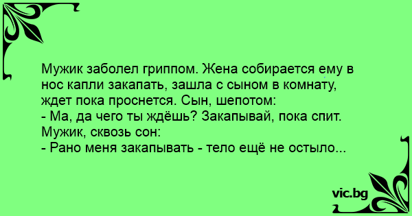 Мужик заболел гриппом. Жена собирается ему в нос капли закапать, зашла с сыном в комнату, ждет пока проснется. Сын, шепотом:<br />- Ма, да чего ты ждёшь? Закапывай, пока спит.<br />Мужик, сквозь сон:<br />- Рано меня закапывать - тело ещё не остыло...