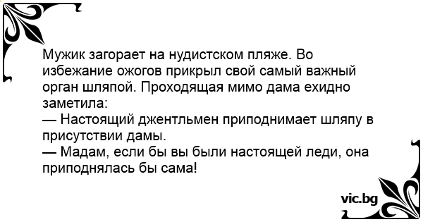 Мужик загорает на нудистском пляже. Во избежание ожогов прикрыл свой самый важный орган шляпой. Проходящая мимо дама ехидно заметила: