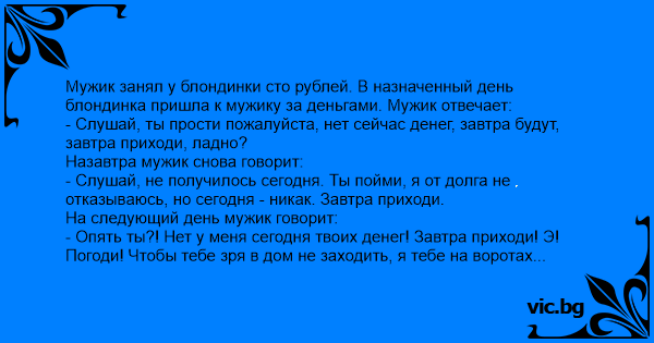 Мужик занял у блондинки сто рублей. В назначенный день блондинка пришла к мужику за деньгами. Мужик отвечает: