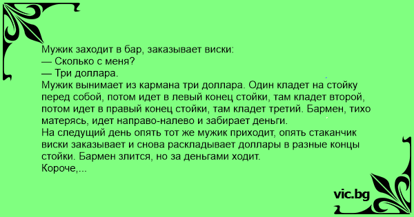 На следущий день опять тот же мужик приходит, опять стаканчик виски заказывает и снова раскладывает доллары в разные концы стойки. Бармен злится, но за деньгами ходит.
