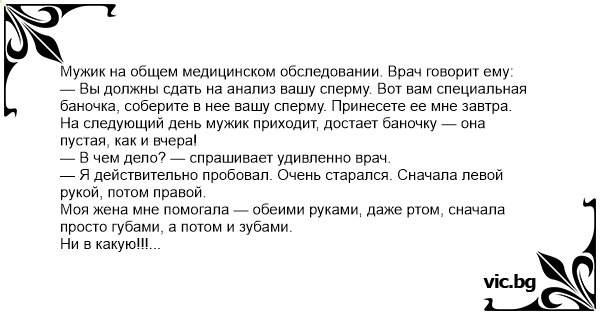 — Вы должны сдать на анализ вашу сперму. Вот вам специальная баночка, соберите в нее вашу сперму. Принесете ее мне завтра.