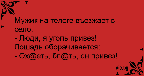 Дядько на возі в'їжджає до села: — Люди !!! Я вугілля привіз !!! Втомлений кінь обертається: — А то ж, курво, ТИ привіз ...