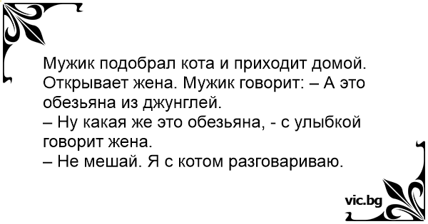 Пиян мъж прибрал едно коте от улицата и тръгнал да се прибира в къщи. Отваря жена му.