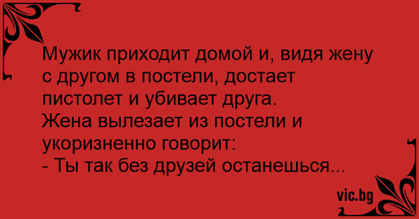 Мужик приходит домой и, видя жену с другом в постели, достает пистолет и убивает друга.