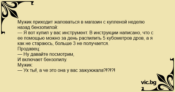 Мужик приходит жаловаться в магазин с купленой неделю назад бензопилой: