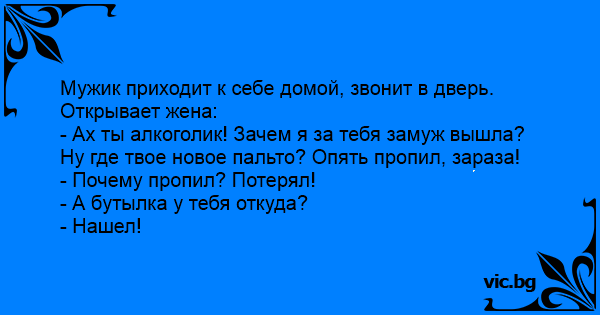- Ах ты алкоголик! Зачем я за тебя замуж вышла? Ну где твое новое пальто? Опять пропил, зараза!