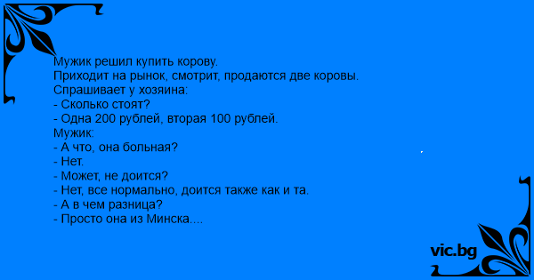 Мужик решил купить корову. Приходит на рынок, смотрит, продаются две коровы. Спрашивает у хозяина: - Сколько стоят? - Одна 200 рублей, вторая 100 рублей. Мужик: - А что, она больная? - Нет. - Может, не доится? - Нет, все нормально, доится также как и та. - А в чем разница? - Просто она из Минска. Подумал мужик - корова отличная, здоровая, молоко дает, ну и взял. Привез к себе, все хорошо, не обманул мужик. Настала пора ее топтать. Приводят быка - бык на нее, она в сторону, бык опять на нее, она брыкается, не дается. Позвал приятеля держать ее, а она все равно дергается, не дается. Вспотевший приятель, вытирая лоб: - Слушай, она у тебя не из Минска? - А... а ты откуда знаешь??? - А, да у меня жена из Минска!