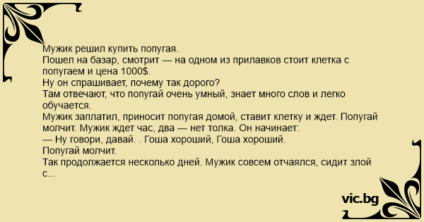 Мужик заплатил, приносит попугая домой, ставит клетку и ждет. Попугай молчит. Мужик ждет час, два — нет толка. Он начинает: