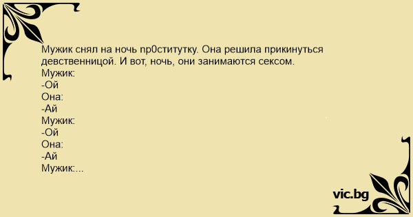 Мужик снял на ночь np0cтитyтку. Она решила прикинуться девственницой. И вот, ночь, они занимаются сексом.
