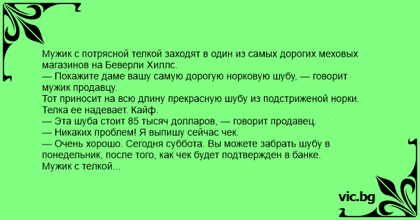 — Очень хорошо. Сегодня суббота. Вы можете забрать шубу в понедельник, после того, как чек будет подтвержден в банке.