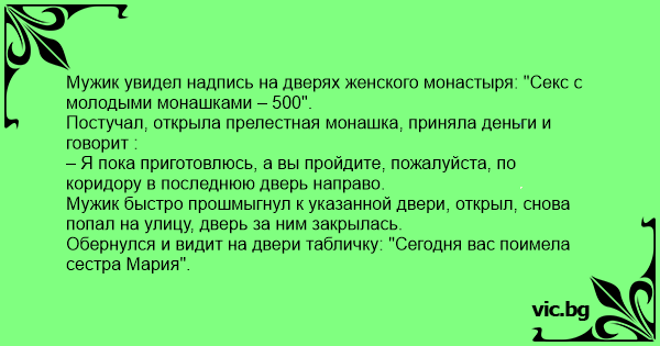 Мъж вижда на вратата на манастир табелка „Чукане с млади монахини – 500 лева“.
