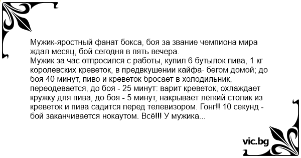 Мужик за час отпросился с работы, купил 6 бутылок пива, 1 кг королевских креветок, в предвкушении кайфа- бегом домой; до боя 40 минут, пиво и креветок бросает в холодильник, переодевается, до боя - 25 минут: варит креветок, охлаждает кружку для пива, до боя - 5 минут, накрывает лёгкий столик из креветок и пива садится перед телевизором. Гонг!! 10 секунд - бой заканчивается нокаутом. Всё!!! У мужика в одной руке очищенная креветка в другой кружка холодного пива! Мужик чуть ли не со слезами смотрит на креветку, на пиво, на креветку, на пиво: