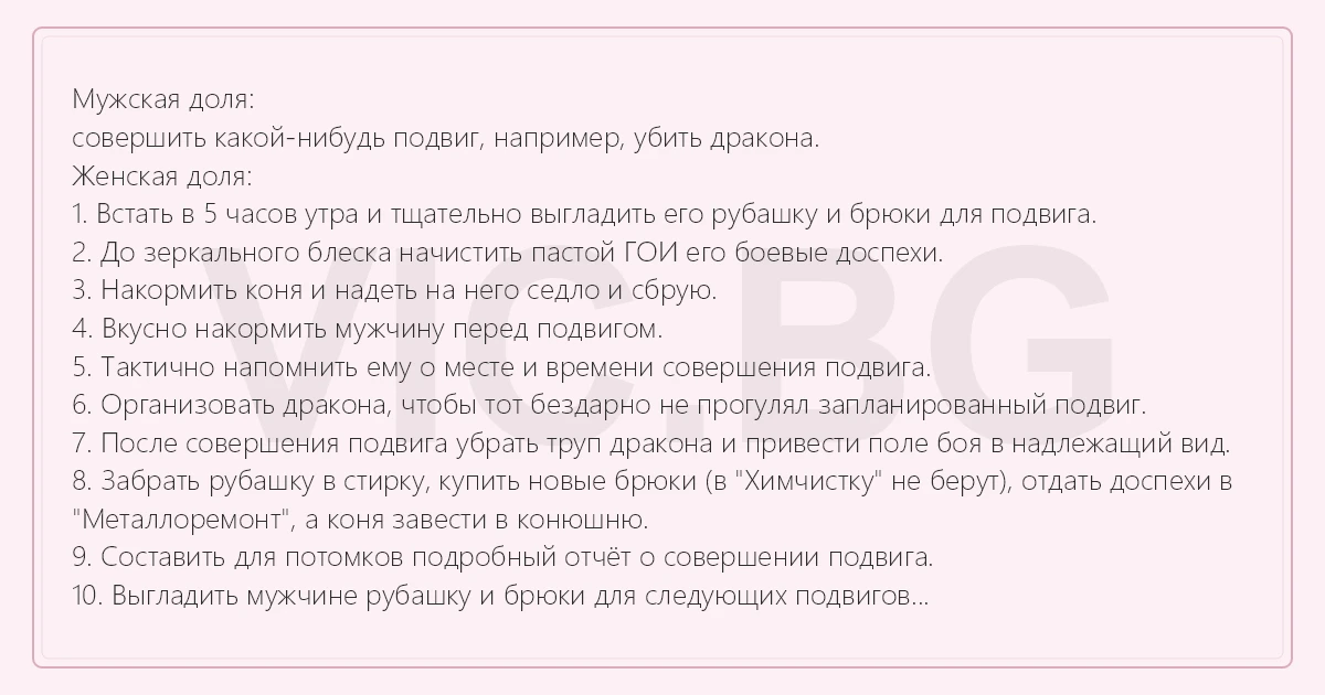 Мужская доля: совершить какой-нибудь подвиг, например, убить дракона. Женская доля: 1. Встать в 5 часов утра и тщательно выгладить его рубашку и брюки для подвига. 2. До зеркального блеска начистить пастой ГОИ его боевые доспехи. 3. Накормить коня и надеть на него седло и сбрую. 4. Вкусно накормить мужчину перед подвигом. 5. Тактично напомнить ему о месте и времени совершения подвига. 6. Организовать дракона, чтобы тот бездарно не прогулял запланированный подвиг. 7. После совершения подвига убрать труп дракона и привести поле боя в надлежащий вид. 8. Забрать рубашку в стирку, купить новые брюки (в "Химчистку" не берут), отдать доспехи в "Металлоремонт", а коня завести в конюшню. 9. Составить для потомков подробный отчёт о совершении подвига. 10. Выгладить мужчине рубашку и брюки для следующих подвигов...