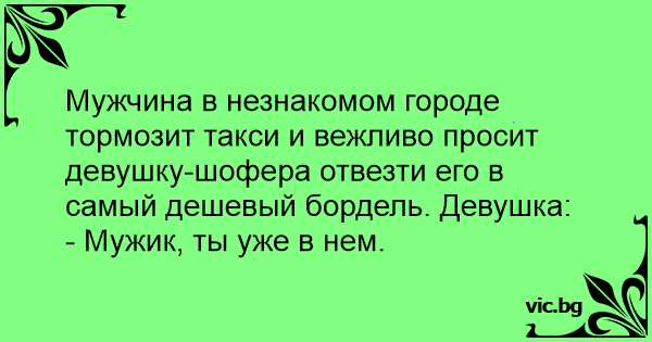 Мужчина в незнакомом городе тормозит такси и вежливо просит девушку-шофера отвезти его в самый дешевый бордель. Девушка: