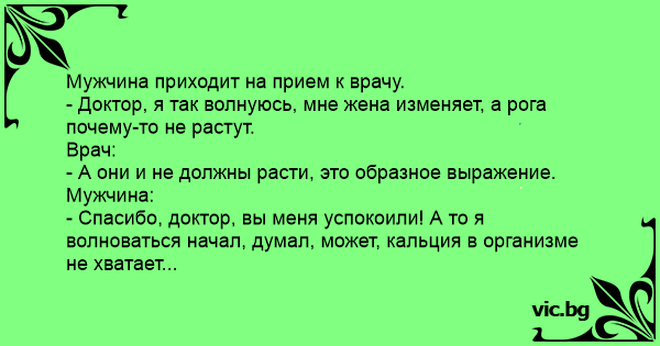 — Лікарю, розумієте, жінка мені зраджує, я це точно знаю, але от роги чомусь не ростуть… — Та ні, це ж такий образний вислів. Вони й не мають виростати. — Ху, слава богу, а то я вже було подумав, що мені кальцію бракує…