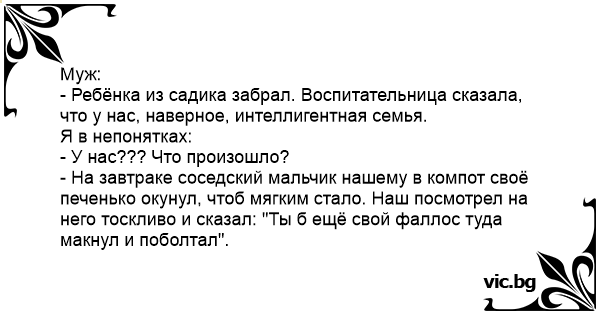 Муж: - Ребёнка из садика забрал. Воспитательница сказала, что у нас, наверное, интеллигентная семья. Я в непонятках: - У нас??? Что произошло? - На завтраке соседский мальчик нашему в компот своё печенько окунул, чтоб мягким стало. Наш посмотрел на него тоскливо и сказал: "Ты б ещё свой фаллос туда макнул и поболтал".
