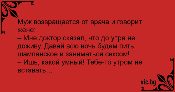 – Мне доктор сказал, что до утра не доживу. Давай всю ночь будем пить шампанское и заниматься cекcом!