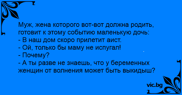 Муж, жена которого вот-вот должна родить, готовит к этому событию маленькую дочь: <br />- В наш дом скоро прилетит аист. <br />- Ой, только бы маму не испугал! <br />- Почему? <br />- А ты разве не знаешь, что у беременных женщин от волнения может быть выкидыш?