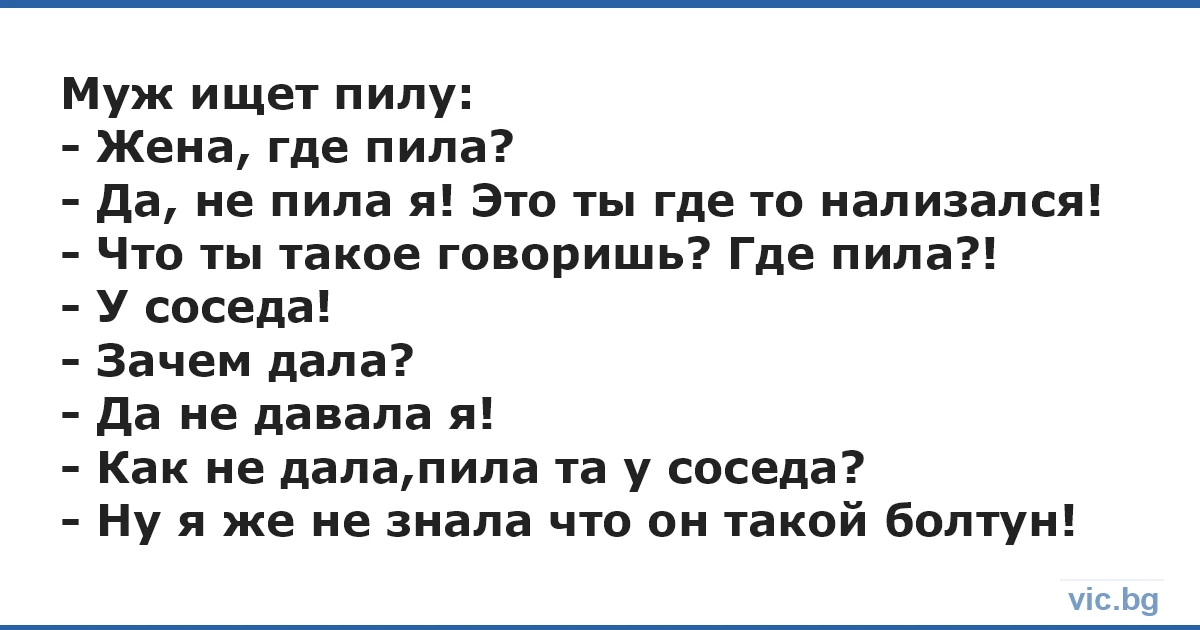 Муж ищет пилу:<br />- Жена, где пила?<br />- Да, не пила я! Это ты где то нализался!<br />- Что ты такое говоришь? Где пила?!<br />- У соседа!<br />- Зачем дала?<br />- Да не давала я!<br />- Как не дала,пила та у соседа?<br />- Ну я же не знала что он такой болтун!