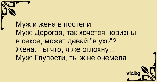 απ΄τ αυτιά Ο Μήτσος και η Μαρία Семейство празнува 20-годишнина от сватбата си. Абе жена, айде да променим нещо в секса? Мъж се обръща към жена си: - А давай я тебя в ухо тр@хну... Au lit, un homme dit tendrement à sa femme : Un homme dit a sa femme : - J aimerais mettre mon sexe dans ton oreille la femme répond : - Ok mais attention que je devienne pas sourde. - ça fait 40ans que je te la mets dans la bouche et t'a... A man says to his wife, "I fancy kinky sex, how about I blow my load in your ear?" The wife hastily replies, "No, I might go deaf!" To which the man replies, "I've been shooting my love wads in... Entre abraços e beijos, o rapaz sussurra para a namorada, com a voz entrecortada de tesão: — Amorzinho, eu gostaria de realizar uma fantasia sexual com você! — E qual é a fantasia? — Eu queria... Na hora do almoço a secretária foi dar uma trepada com o chefe em seu gabinete, o chefe falou? - Deixa eu gozá no seu ouvido?? - Não... aí eu fico surda! - Ah, mas a semana passada você não... Nej for helvede “Må jeg komme i dit øre?” Konen: “Nej du må ej, jeg kunne blive døv” Manden: “Nej, jeg er kommet i din mund i 20 år, og du kan stadigvæk ikke holde din kæft” – Cara, ho voglia di scoparti. – No, stasera non posso, ho le mie cose. – Allora te lo metto nel culo… – Non posso, ho le emorroidi. – E se te lo mettessi nell’orecchio??? – Ma non divento sorda???... Man zegt tegen vrouw: Zeg, mag ik vanavond es uw oor neuken? Vrouw: ga ik dan ni doof worden, Man : tuurlijk nie, 'k steek em al 15 jaar in uwe mond en ge zwijgt nog ni Een man komt thuis van zijn werk en roept zijn vrouw bij zich. "Schatje" zegt hij " mag ik hem eens in jou oor steken ?" "In mijn oor ?!?" zegt de vrouw verontwaardigd "nee je mag hem niet in mijn... Zegt Camiel tegen z’n vrouw: “Zeg Maria…, is ‘t goed dakkem ‘ne keer in je oor steek?” Zegt Maria : “Jah maar Camiel, ik ga er toch ni doof van worden hé?” Zegt Camiel terug : “Maar bijlange ni, ik... Marido: querida me dejas que te la ponga por la oreja Esposa: ay no me vas a dejar sorda Marido: pero si siempre te la pongo por la boca y nunca te quedaste muda A cigány azt mondja a feleségének: - Anyjuk, ma a füledbe dugom jó? - Nem jó apjuk, mert megsüketülök! - Süketülsz meg az anyád hétszentségét, múltkor a szádba dugtam, mégsem némultál meg! Theres a man and a woman the man says honey can I stick my dick in your ear, she says no it may cause me to go deaf, the man says will I'm gonna stick my dick in yo mouth so u shut the f*ck up Due fidanzati devono fare sesso il fidanzato le dice: "Oggi il cazzo te lo posso mettere nell'orecchio?" E la fidanzata: "Ma sei scemo?così divento sorda" E il fidanzato: "Perchè tutte le altre...