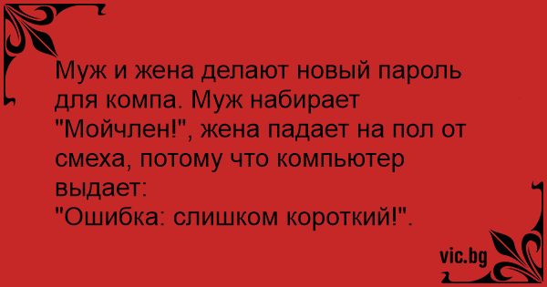 Семейство сменя паролата на семейния компютър. A husband and wife are trying to set up a new password for their computer. Мъж сменя паролата на компютъра, жена му го гледа. Ein Mann kauft sich einen Computer. Zuhause beim Einrichten des PCs wird er aufgefordert: A female secretary was helping her new boss set up his computer and asked him what word he would like to use as a password to log in with. Un homme met à jour le mot de passe de son ordinateur. Il tape « monzizi ». C'est un gars qui se crée une adresse email et au moment de rentrer le mot de passe, pour se la jouer devant sa femme, il met ''Pénis''. Sa femme se met à éclater de rire car l'ordinateur indiquait: '' Trop court''... Ein Mann geht ins Geschäft und kauft sich einen Computer. Beim Einrichten des PC's fragt der Computer: "Bitte wählen Sie ein Passwort!" Der Mann überlegt etwas und legt als Passwort Penis fest. Daraufhin antwortet der Computer: "Ihr Passwort ist zu... Informatyk staje przed komputerem wyposażonym w synchronizator mowy i słyszy: - Proszę wprowadzić hasło... Informatyk wystukuje hasło: penis. Na to komputer: - Przykro mi, ale Twoje hasło jest zbyt... Passwort : Penis „ihr Passwort ist nicht lang genug". Un gars un peu obsédé s'inscrit sur un site internet. Après avoir tapé son adresse-mail, l'ordi lui demande un mot de passe. Alors, il écrit : "ma bite". Un message s'affiche : "Trop court. Désolé,... Una consultora informática, que estaba ayudando a un hombre a configurar su ordenador, le pregunta que qué palabra le gustaría utilizar como contraseña para entrar en su sistema. Con la intención... Une femme est en train d'aider son mari à installer son nouvel ordinateur. L'homme, un peu macho, doit choisir son mot de passe. Il regarde sa femme fièrement et tape: "Pénis" Sa femme se met à se... Password Pene Password non abbastanza lunga Eräänä päivänä Keijon tietokone herjasi Keijolle: ”Create new password”. Suuressa miehisyydessään Keijo vaihtoi hymyillen salasanaksi ”penis”. Hymy kuitenkin hyytyi, kun tietokone ilmoitti... Een dame hielp haar man bij het installeren van een computer. Tijdens de procedure vroeg ze haar man om een passwoord in te voeren om te kunnen inloggen. De man was in een amoureuze bui, en om zijn... Une jeune informaticienne qui paramétrait la nouvelle bécane d'un utilisateur, lui demanda quel mot de passe il voulait utiliser pour accéder au réseau. Voulant taquiner la gamine, il lui dit... Ein Mann und eine Frau geben ein Passwort für ihren neuen Computer ein schreibt der Mann:,meinpenis " in die Spalte . seine Frau krümmt sich vor lachen den Bauch : im Computer steht zu kurz Va povestesc mai jos un CAZ REAL, povestit de un prieten... O femeie, inginer de sistem, instala un calculator intr-o retea pentru un coleg de la birou. Cand a venit randul setarii parolelor ea l-a... Zadejte vaše heslo: Uživatel: "Penis" PC: Vaše heslo je príliš krátké! Le président veut s'inscrire sur un site de rencontre et doit rentrer un mot de passe, Il rentre "pénis" Que dit le confirmateur automatique ? Erreur ! Votre mot de passe est trop court !! Oggi sul mio computer ho voluto cambiare la password. Volevo mettere: pene, ma lui mi ha detto: ‘Nome troppo corto’.