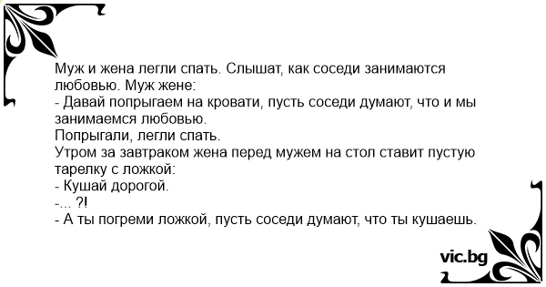 Муж и жена легли спать. Слышат, как соседи занимаются любовью. Муж жене: