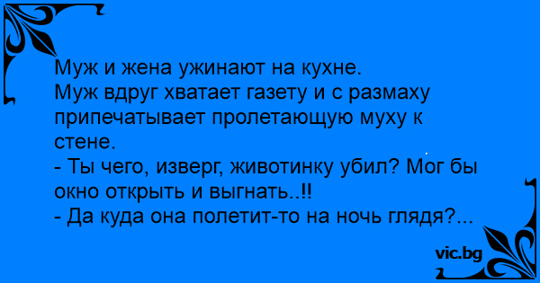 Муж вдруг хватает газету и с размаху припечатывает пролетающую муху к стене.