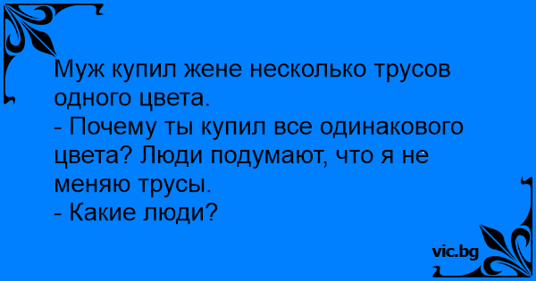 Чоловік купив дружині декілька однакових трусиків одного кольору. — Вони ж зовсім однакові! Навіщо ти їх купив? Люди подумають, що я не змінюю нижню білизну! — Які люди?
