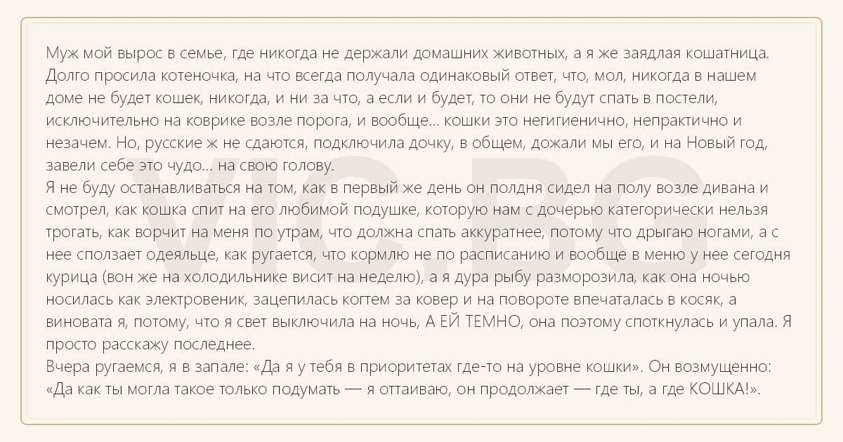 Муж мой вырос в семье, где никогда не держали домашних животных, а я же заядлая кошатница. Долго просила котеночка, на что всегда получала одинаковый ответ, что, мол, никогда в нашем доме не будет кошек, никогда, и ни за что, а если и будет, то они не будут спать в постели, исключительно на коврике возле порога, и вообще… кошки это негигиенично, непрактично и незачем. Но, русские ж не сдаются, подключила дочку, в общем, дожали мы его, и на Новый год, завели себе это чудо... на свою голову. Я не буду останавливаться на том, как в первый же день он полдня сидел на полу возле дивана и смотрел, как кошка спит на его любимой подушке, которую нам с дочерью категорически нельзя трогать, как ворчит на меня по утрам, что должна спать аккуратнее, потому что дрыгаю ногами, а с нее сползает одеяльце, как ругается, что кормлю не по расписанию и вообще в меню у нее сегодня курица (вон же на холодильнике висит на неделю), а я дура рыбу разморозила, как она ночью носилась как электровеник, зацепилась когтем за ковер и на повороте впечаталась в косяк, а виновата я, потому, что я свет выключила на ночь, А ЕЙ ТЕМНО, она поэтому споткнулась и упала. Я просто расскажу последнее. Вчера ругаемся, я в запале: «Да я у тебя в приоритетах где-то на уровне кошки». Он возмущенно: «Да как ты могла такое только подумать — я оттаиваю, он продолжает — где ты, а где КОШКА!».