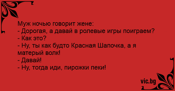 Муж ночью говорит жене:<br />- Дорогая, а давай в ролевые игры поиграем?<br />- Как это?<br />- Ну, ты как будто Красная Шапочка, а я матерый волк!<br />- Давай!<br />- Ну, тогда иди, пирожки пеки!
