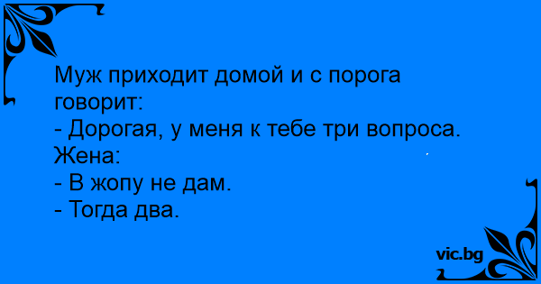 - дорогая, у меня к тебе три вопроса. - в жопу- не дам! - тогда... Митко към новата си приятелка: