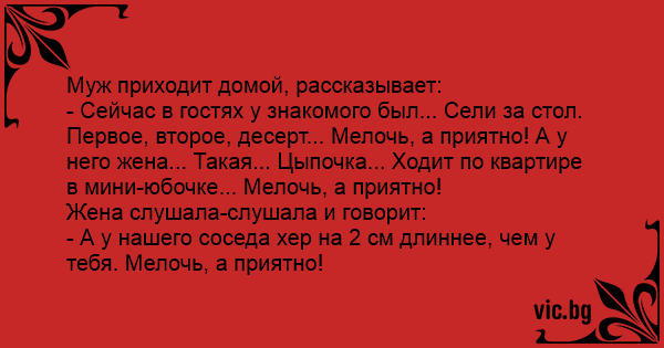 - А у нашего соседа хер на 2 см длиннее, чем у тебя. Мелочь, а приятно!