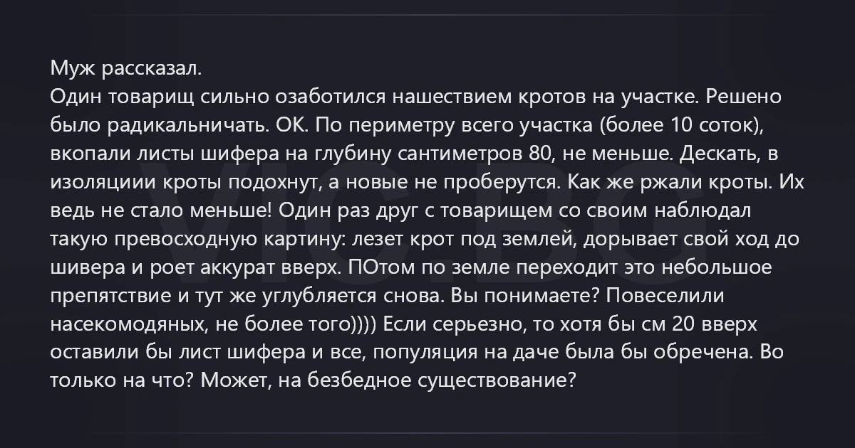 Муж рассказал. Один товарищ сильно озаботился нашествием кротов на участке. Решено было радикальничать. ОК. По периметру всего участка (более 10 соток), вкопали листы шифера на глубину сантиметров 80, не меньше. Дескать, в изоляциии кроты подохнут, а новые не проберутся. Как же ржали кроты. Их ведь не стало меньше! Один раз друг с товарищем со своим наблюдал такую превосходную картину: лезет крот под землей, дорывает свой ход до шивера и роет аккурат вверх. ПОтом по земле переходит это небольшое препятствие и тут же углубляется снова. Вы понимаете? Повеселили насекомодяных, не более того)))) Если серьезно, то хотя бы см 20 вверх оставили бы лист шифера и все, популяция на даче была бы обречена. Во только на что? Может, на безбедное существование?