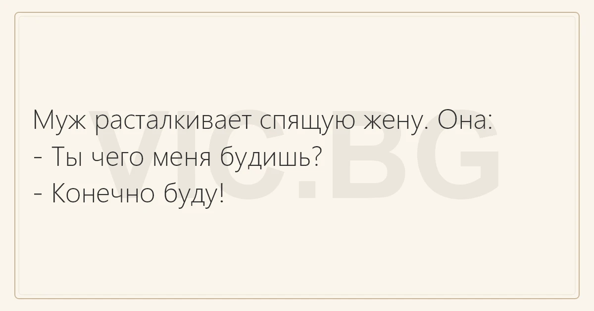 Муж расталкивает спящую жену. Она: - Ты чего меня будишь? - Конечно буду!