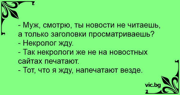 - Защо четеш само заглавията във вестника?! - Търся некролог - Некролозите не ги печатат на първа страница?! - Този, които аз чакам, ще го напечатат
