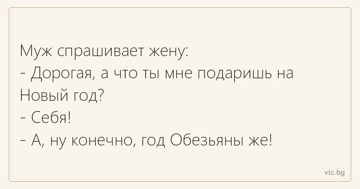 Муж спрашивает жену:<br />- Дорогая, а что ты мне подаришь на Новый год?<br />- Себя!<br />- А, ну конечно, год Обезьяны же!