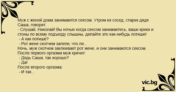 Муж с женой дома занимаются сексом. Утром их сосед, старик дядя Саша, говорит: