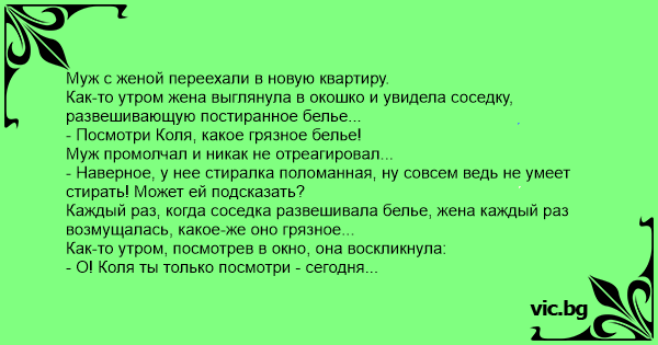 Каждый раз, когда соседка развешивала белье, жена каждый раз возмущалась, какое-же оно грязное...