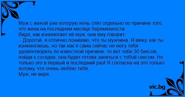 - Дорогой, я отлично понимаю, что ты мужчина. Я вижу, как ты изнемогаешь, но так как я сама сейчас не могу тебя удовлетворить по известной причине, то вот тебе 30 баксов, пойди к соседке, она будет готова заняться с тобой сексом. Но только это в первый и последний раз! Я согласна на это только потому, что очень люблю тебя...