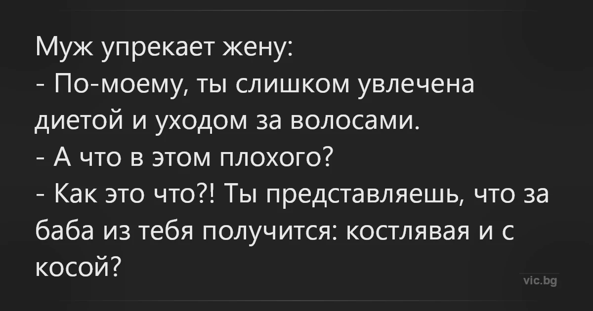 Муж упрекает жену:<br />- По-моему, ты слишком увлечена диетой и уходом за волосами.<br />- А что в этом плохого?<br />- Как это что?! Ты представляешь, что за баба из тебя получится: костлявая и с косой?