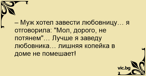 – Муж хотел завести любовницу… я отговорила: "Мол, дорого, не потянем"… Лучше я заведу любовника… лишняя копейка в доме не помешает!