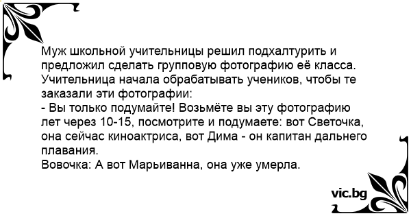 Муж школьной учительницы решил подхалтурить и предложил сделать групповую фотографию её класса. Учительница начала обрабатывать учеников, чтобы те заказали эти фотографии: