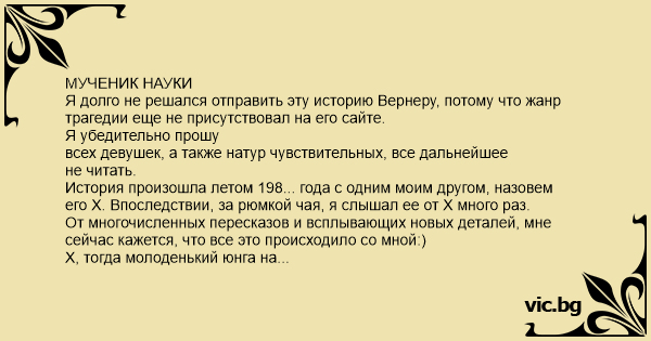 МУЧЕНИК НАУКИ Я долго не решался отправить эту историю Вернеру, потому что жанр трагедии еще не присутствовал на его сайте.