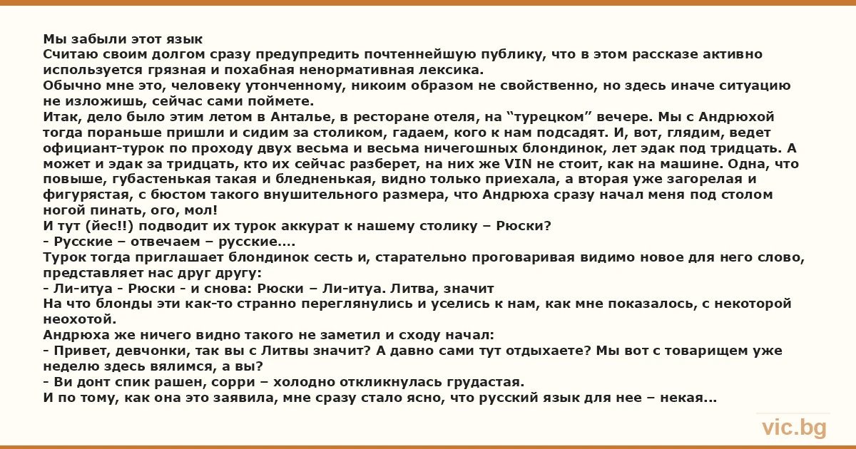 - Привет, девчонки, так вы с Литвы значит? А давно сами тут отдыхаете? Мы вот с товарищем уже неделю здесь вялимся, а вы?