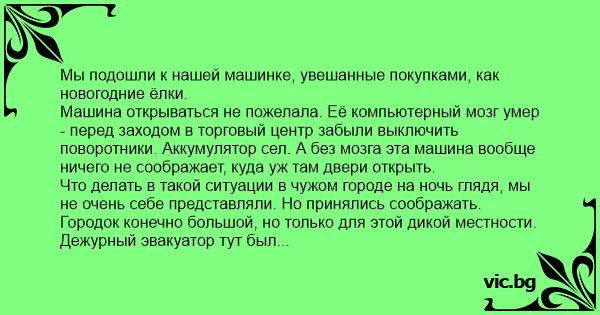 Мы подошли к нашей машинке, увешанные покупками, как новогодние ёлки.