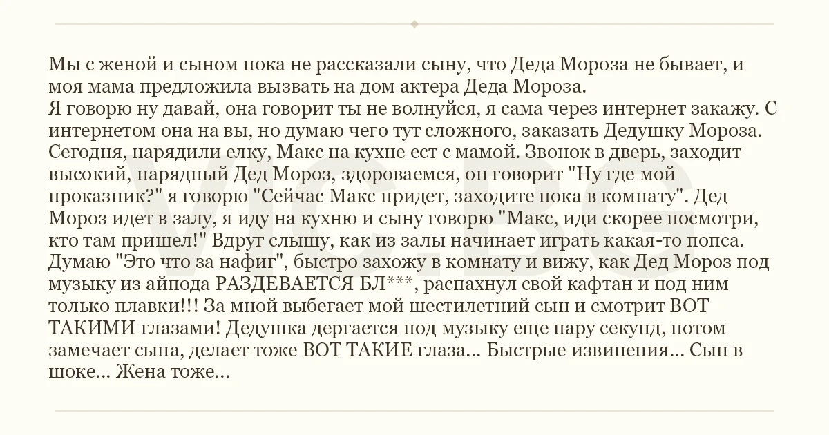 Мы с женой и сыном пока не рассказали сыну, что Деда Мороза не бывает, и моя мама предложила вызвать на дом актера Деда Мороза. Я говорю ну давай, она говорит ты не волнуйся, я сама через интернет закажу. С интернетом она на вы, но думаю чего тут сложного, заказать Дедушку Мороза. Сегодня, нарядили елку, Макс на кухне ест с мамой. Звонок в дверь, заходит высокий, нарядный Дед Мороз, здороваемся, он говорит "Ну где мой проказник?" я говорю "Сейчас Макс придет, заходите пока в комнату". Дед Мороз идет в залу, я иду на кухню и сыну говорю "Макс, иди скорее посмотри, кто там пришел!" Вдруг слышу, как из залы начинает играть какая-то попса. Думаю "Это что за нафиг", быстро захожу в комнату и вижу, как Дед Мороз под музыку из айпода РАЗДЕВАЕТСЯ БЛ***, распахнул свой кафтан и под ним только плавки!!! За мной выбегает мой шестилетний сын и смотрит ВОТ ТАКИМИ глазами! Дедушка дергается под музыку еще пару секунд, потом замечает сына, делает тоже ВОТ ТАКИЕ глаза... Быстрые извинения... Сын в шоке... Жена тоже...