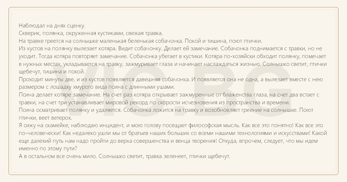 Наблюдал на днях сценку. Скверик, полянка, окруженная кустиками, свежая травка. На травке греется на солнышке маленькая беленькая собачонка. Покой и тишина, поют птички. Из кустов на полянку вылезает котяра. Видит собачонку. Делает ей замечание. Собачонка поднимается с травки, но не уходит. Тогда котяра повторяет замечание. Собачонка убегает в кустики. Котяра по-хозяйски обходит полянку, помечает в нужных местах, укладывается на травку, зажмуривает глаза и начинает наслаждаться жизнью. Солнышко светит, птички щебечут, тишина и покой. Проходит минуты две, и из кустов появляется давешняя собачонка. И появляется она не одна, а вылезает вместе с нею размером с лошадку хмурого вида псина с длинными ушами. Псина делает котяре замечание. На счет раз котяра открывает зажмуренные от блаженства глаза, на счет два встает с травки, на счет три устанавливает мировой рекорд по скорости исчезновения из пространства и времени. Псина осматривает полянку и удаляется. Собачонка ложится на травку и возобновляет греение на солнышке. Поют птички, веет ветерок. Я сижу на скамейке, наблюдаю инцидент, и мою голову посещает философская мысль. Как все это понятно! Как все это по-человечески! Как недалеко ушли мы от братьев наших больших со всеми нашими технологиями и искусствами! Какой еще далекий путь нам надо пройти до верха совершенства и венца творения! Откуда, впрочем, следует, что мы идем именно по этому пути? А в остальном все очень мило. Солнышко светит, травка зеленеет, птички щебечут.