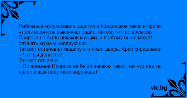 Арабин се качва в такси и отсечено нарежда на водача да спре музиката в колата, защото му е забранено да слуша музиката на "неверниците" и, че такава музика не е имало по времето на пророка.